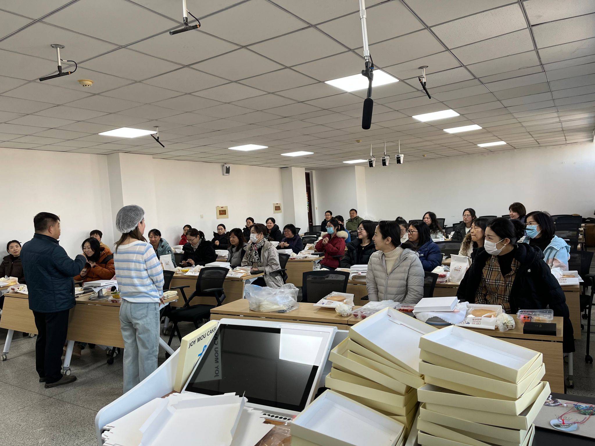 活动中,学院工会主席张晶辉向与会人员送上了节日的慰问,随后在专业的烘焙老师现场指导下,女同胞们将切好的水果放入蛋糕胚中,然后再用奶油裱花,大家发挥出了自己的创意和想象力,一个个风格各异的蛋糕逐渐成形,虽然手法略显生疏,但每一个作品都饱含着大家的用心和巧思。活动过程中,大家相互交流、互相帮助,分享着蛋糕制作的乐趣和节日的喜悦,在互动中拉近了距离,增进了感情。